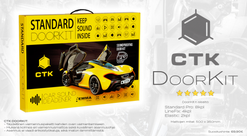 | Vaimennusmateriaalit alk.11,90€(CTK speakerkit) CTK Doorkit uutuus vaimennussarja, jolla vaimennat tehokkaasti molemmat ovet: 69€ Silent Coat on uusi todella tehokas liimapintainen ja alumiinivahvisteinen butyylimatto auton äänieristykseen. Tuote on vettä hylkivää eikä vaadi lämmitystä asennuksen yhteydessä. Silent Coat BulkPack isompi pakkauskoko 1,875m³ nyt hintaan: 39€